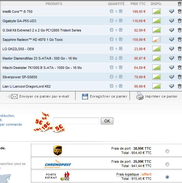 Un seul DD de 500 Go (F3) au vue du faible besoin (30 go sur la config exemple) Et une alim Antec True Power New 650 W 80+ bronze et modulaire Ca fait un total livré et monté pour 885€: Samsung Spinpoint F3 S-ATA - 500 Go - 16 Mo ![]() ![]() ![]() G.Skill Kit Extreme3 2 x 2 Go PC10600 Ripjaws ![]() ![]() ![]() Sapphire Radeon™ HD 4870 1 Go Vapor-X ![]() ![]() ![]() Intel® Core™ i5 750 ![]() ![]() ![]() Gigabyte GA-P55-UD3 ![]() ![]() ![]() Lian Li Lancool DragonLord K62 ![]() ![]() ![]() Antec TruePower New - 650W ![]() ![]() ![]() LG GH22LS50 - OEM ![]() ![]() ![]() Materiel.net Montage ![]() ![]() ![]() Total : 885,96 € TTC fdp in Mais à nouveau, l'écran serait le bien venu |