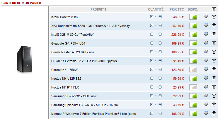 ![]() ![]() ![]() ![]() ![]() Intel® X25-M 80 Go "PostVille" ![]() ![]() ![]() XFX Radeon™ HD 5850 1Go, DirectX® 11, ATI Eyefinity ![]() ![]() ![]() ![]() ![]() Intel® Core™ i7 860 ![]() ![]() ![]() ![]() ![]() Gigabyte GA-P55A-UD4 ![]() ![]() ![]() ![]() ![]() G.Skill Kit Extreme3 2 x 2 Go PC10600 NQ ![]() ![]() ![]() ![]() ![]() Fractal Design Define R2 - argent ![]() ![]() ![]() ![]() ![]() Corsair HX - 750W ![]() ![]() ![]() ![]() ![]() Samsung SH-S223C - OEM, noir ![]() ![]() ![]() ![]() ![]() Noctua NH-U12P SE2 ![]() ![]() ![]() ![]() ![]() Noctua NF-P14 FLX ![]() ![]() ![]() ![]() ![]() Noctua NF-S12B FLX ![]() ![]() ![]() ![]() ![]() Microsoft Windows 7 Edition Familiale Premium 64 bits (oem) ![]() ![]() ![]() ![]() ![]() 1800€, mêmes perfs CPU que ta config, plus de perfs GPU, et SSD Intel qui gère nativement la commande TRIM avec seven pour sa durée de vie, c'est également un des meilleurs SSD sur le marché. |