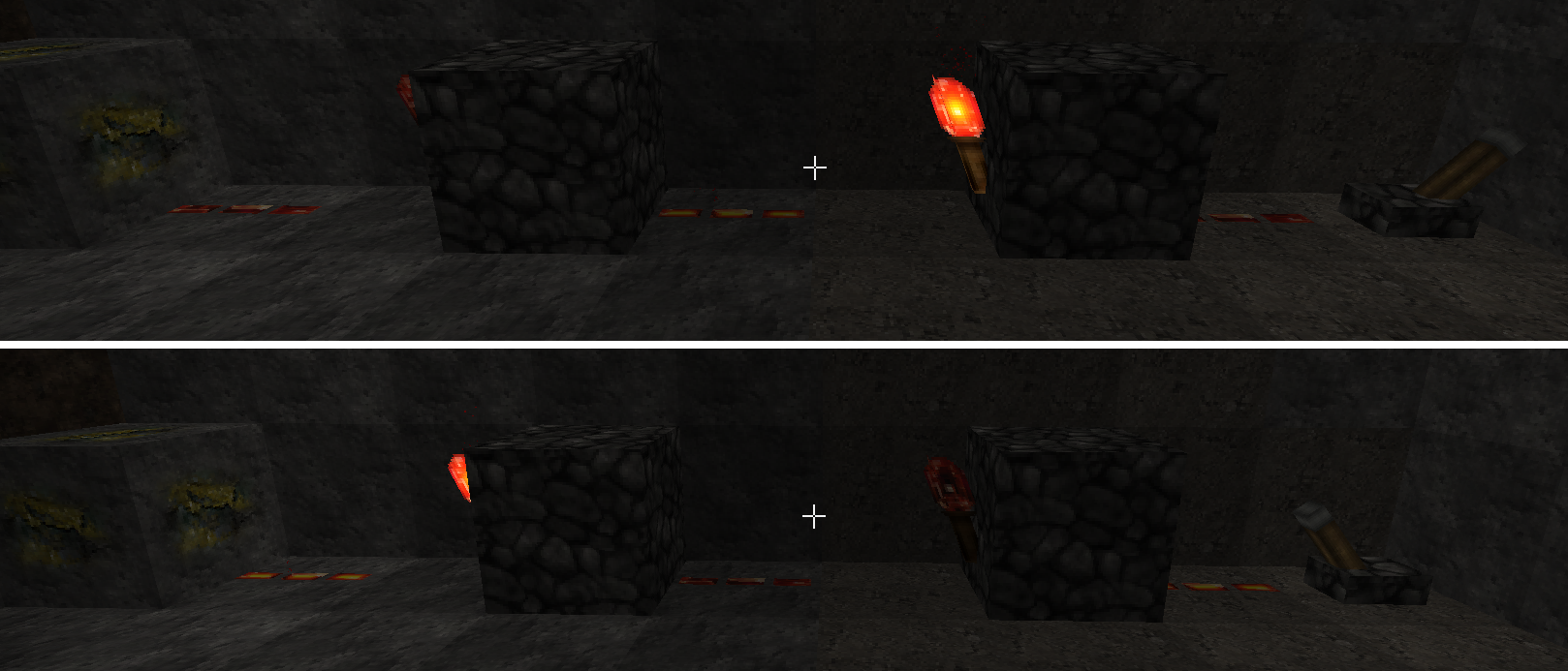 Perso j'arrive pas à faire un système pour qu'en activant un levier des torches posées au sol s'allument/s'éteignent sans avoir de circuits visibles :/.