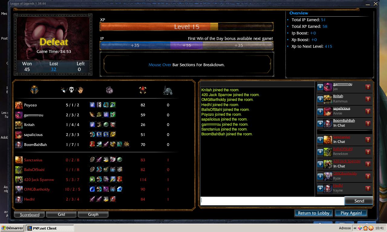 Je ne demande pas aux autres de jouer comme des pgm, d'ailleurs je suis très loin d'en être un, mais les comportements des joueurs que je croise en ce moment me révulsent. Par exemple une vayne mid vs un ryze ça ne se fait pas no match en feedant et en perdant sa tour en 9 minutes, que le joueur soit débutant ou non (encore que, autour du lvl 15 tu dois tout de même savoir que si le type en face t'as déjà tué trois fois, c'est con de t'éloigner de ta tour, tu joue safe, tout simplement) Tout ça à plus forte raison que j'essaye d'aider le plus possible dans le jeu, je ward au maximum, j'encourage lorsque ça fait un beau move, je fais les buff pour ceux qui en ont besoin et tout, mais rien n'y fait, impossible d'arriver à gagner tellement les gens ont l'air de se foutre du jeu et de l'équipe. Les mecs préfèrent farm dans leur coin ou se suicider en boucle en pensant que c'est des pro et qu'ils vont faire la game à eux seul en engageant 1v4.