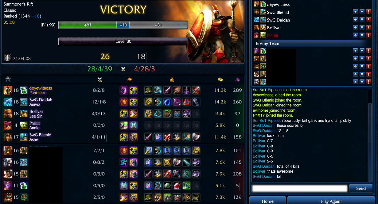 La Annie nous a quitté en pleine selection et ca n'a pas leave pour je-ne-sais-quelle raison. A noter qu'elle a plus de gold que la Soraka ennemie ^^ |