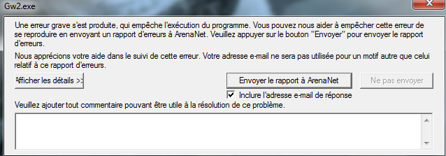 Je comprends pas depuis ce matin j'ai un soucis sur GW2, je jouais pèpère et d'un coup j'ai un écran qui pop (en pièce-jointe) et c'est un retour windows assuré... Ca me le fait au bout de quelques minutes de jeu ou carrément pendant l'écran de chargement au lancement du jeu.