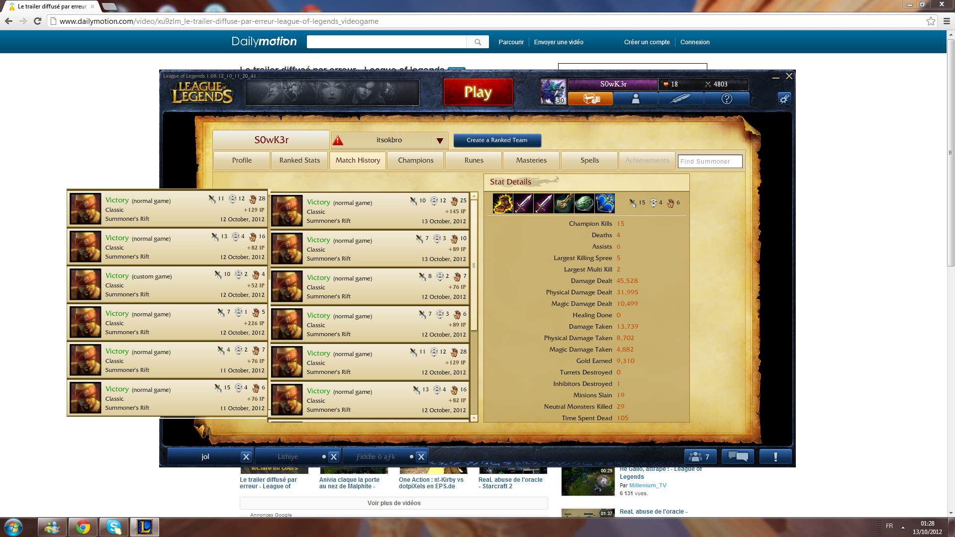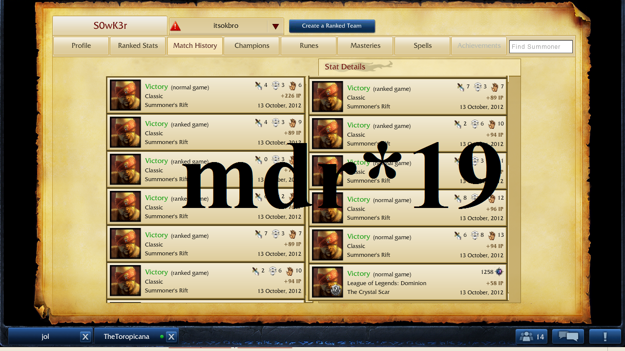 20/6/11 avec Tristana, et on perd parce que on a GP support inutile tout le long de la game...