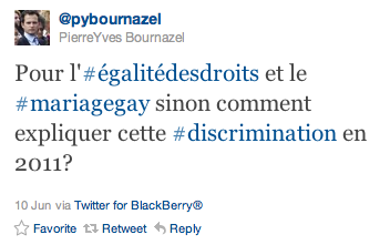 Pierre-Yves Bournazel, candidat à la primaire UMP pour la mairie de Paris. En 2011 il était pour l'ouverture du mariage aux couples de même sexe «Moi je suis pour l'égalité des droits, on est en 2011 dans une société qui doit être décomplexée» «Le PACS ce n'est pas les mêmes droits pour les couples homos et hétéros» Lien ![]() Mais il a bien noté que NKM se retrouvait en difficulté suite à ses prises de position sur ce sujet, du coup il a totalement changé d'avis et soutient Barjot il voudrait même l'accueillir sur l'une de ses listes, d'après NDF il participerait à la Manif pour tous du 26 mai en déclarant « Si j’avais été député, j’aurais voté contre la loi Taubira » Citation :