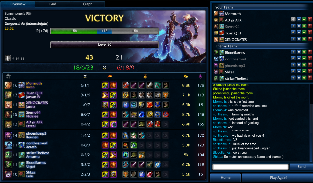 Better nerf Irelia. C'est fou comme ce champion est faceroll. T'as même pas besoin de gagner ta lane, suffit que tu choppes 200 creeps et c'est gagné. J'ai dû commencer la game avec un truc genre 1/5, je me faisais dive par le mid/jungler/darius à partir du niveau 4, la Elise campait sa jungle. Au final, on a dû enchaine 4-5 ace pour réussir à tout push : quand les ennemis focus Irelia, ça prend tellement de temps pour la down que les alliés ont le temps de les ace et quand ils l'ignorent, c'est elle qui les depop un par un.