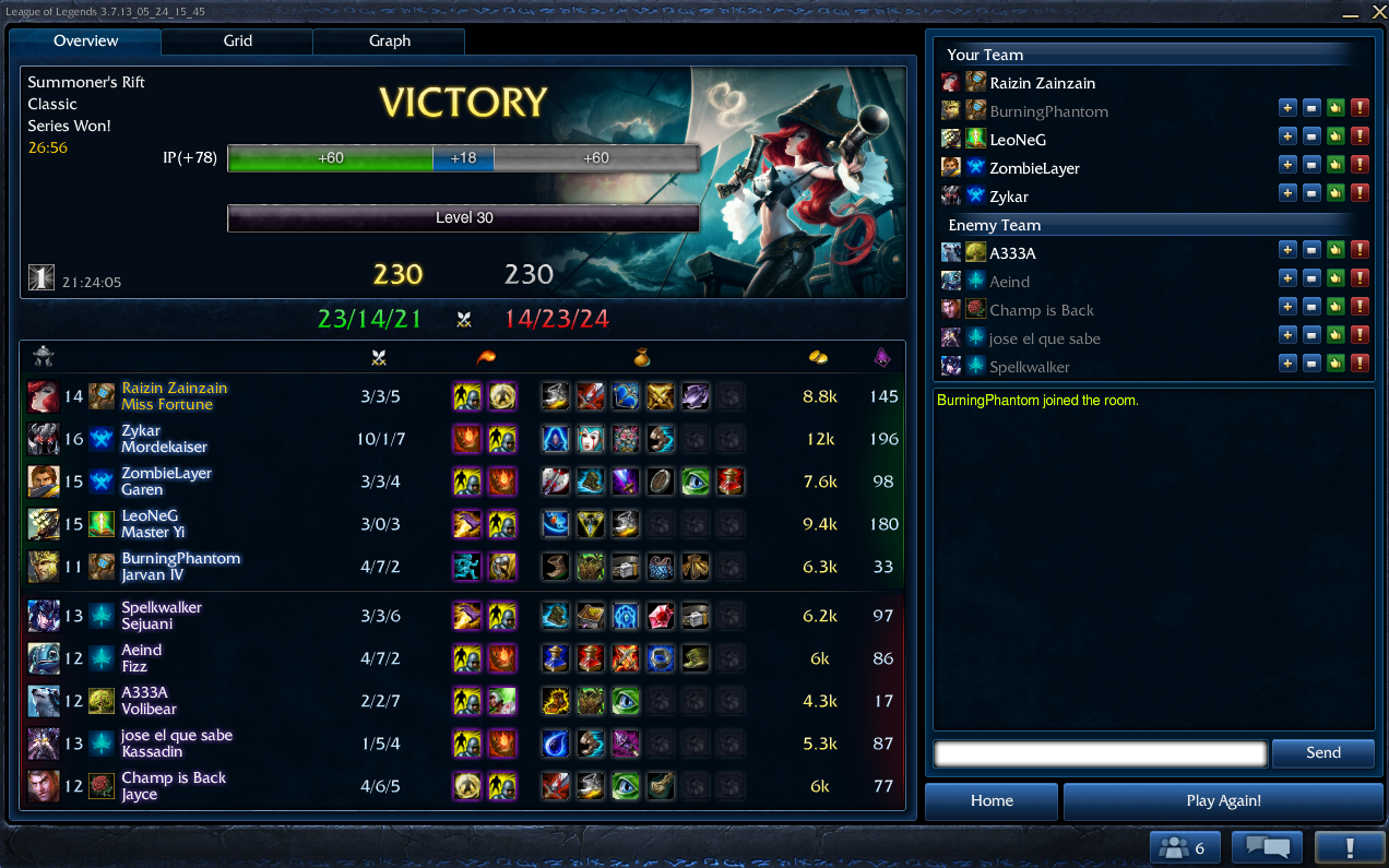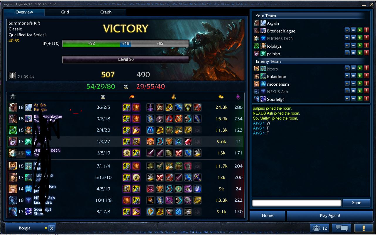 Je stomp la botlane mais toutes les autres lanes sont perdues, je swap avec Renekton, je tue Fiora 2-3 fois, je prends la tour top, je vais au mid, je prends la tour mid, on gagne tous les 1v1, 2v2, on push jusqu'à l'inib mid, je prends les 2eme tours top et bot, mais au premier teamfight j'ai explosé comme le reste de ma team. :/