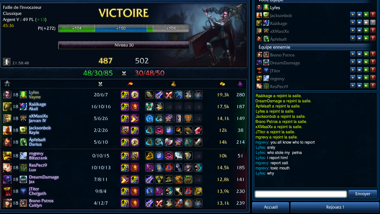 En plus de ca, j'avais une kayle semi afk qui s'est constamment fait grab, un jax qui camp le bot, un darius afk la moitié du temps en temoigne ses assits (darius barrier, nouveau meta), et une akali qui nous troll a la fin parce que je lui demande de pas trow.