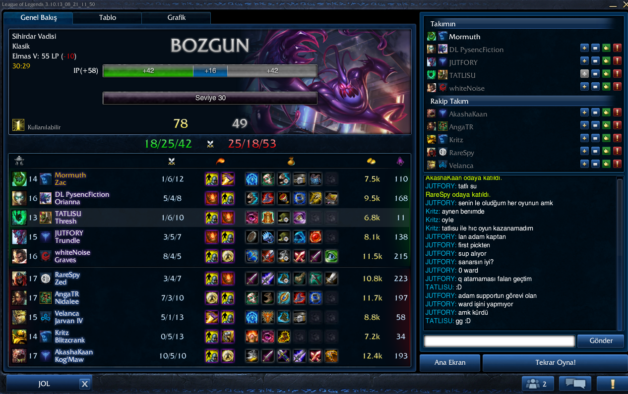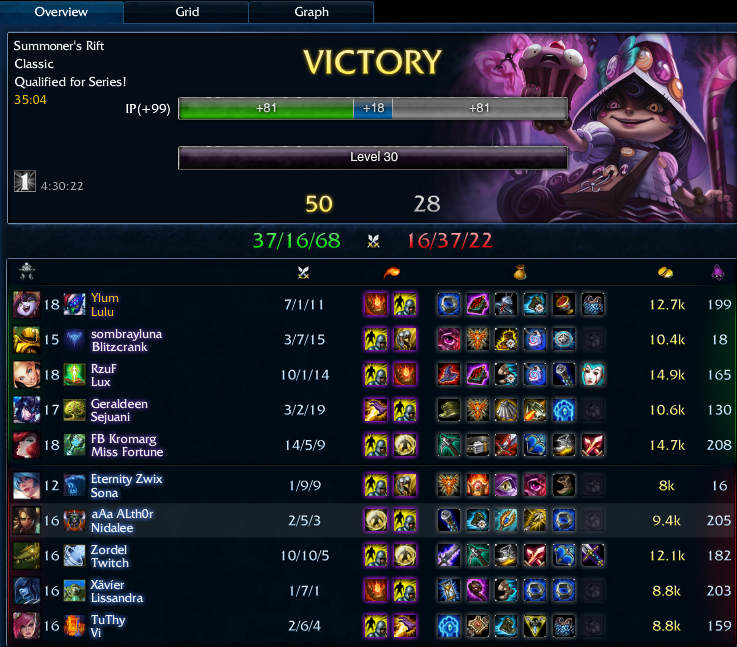 3/0 en lane, mais je farm mal donc je quitte le top à égalité de farm (~150) vers les 23min. Jax s'est fait trick2g par Nunu (il a réussi à fail son smite sur le bleu) mais bon np il a réussi à s'en remettre plus ou moins avec l'aide de la team. Zyra part full ap, elle a acheté l'item a ward à la dernière minute pour la forme I guess. Du coup mf qq et je lui cède le top donc j'ai plus farm de la game pendant 10min.