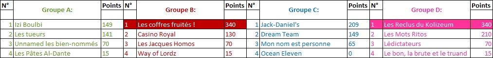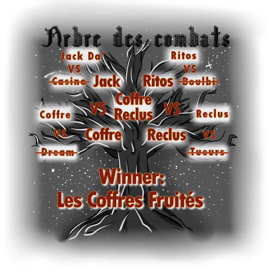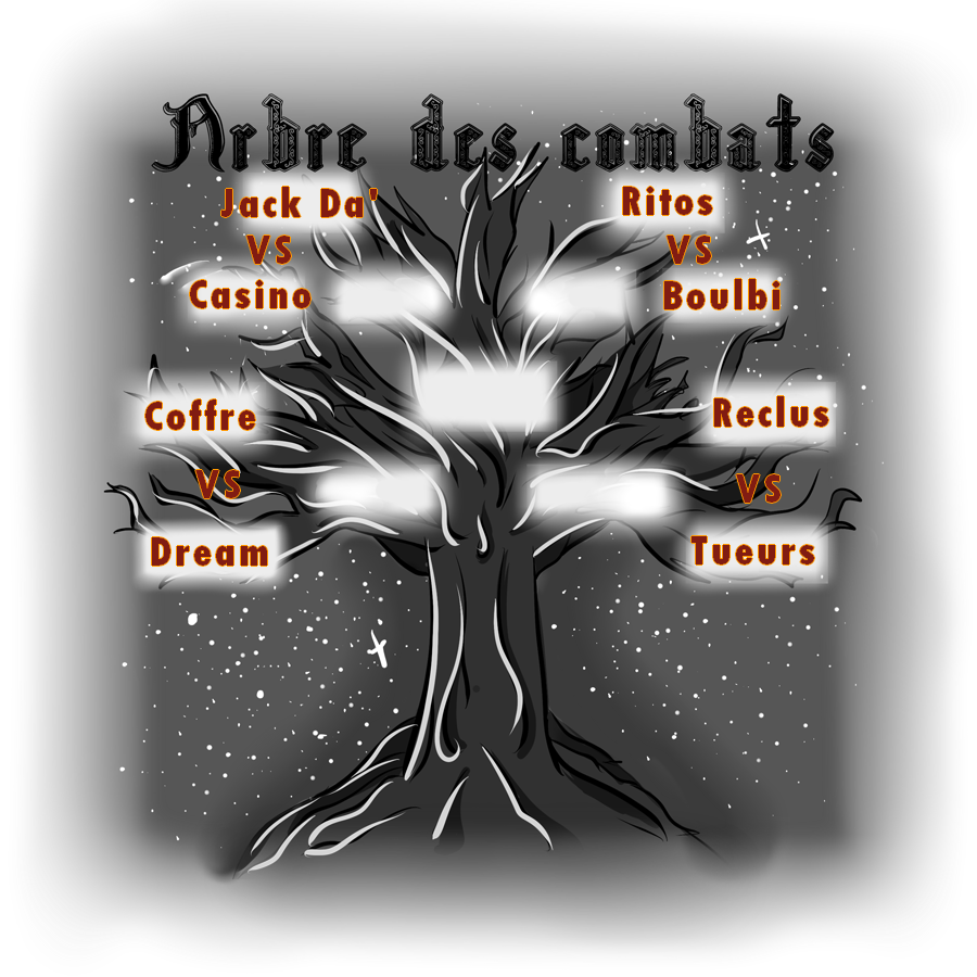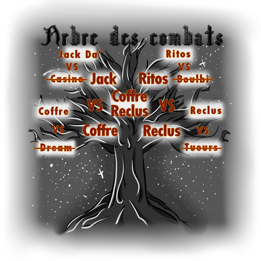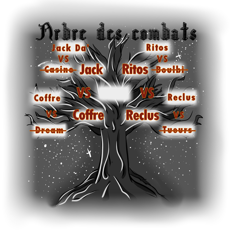 Je vous rappelle l'arbre des combats pour ces phases finales: Et je vous souhaite une agréable soirée, puisque je ne serai pas là ce soir. Bon courage à mes co-équipiers du coup qui assureront le stream normalement à l'heure ! ^-^ A demain ! |