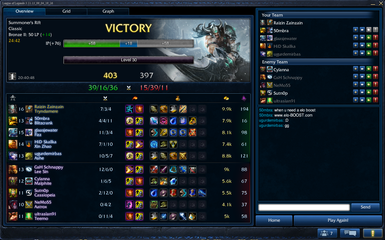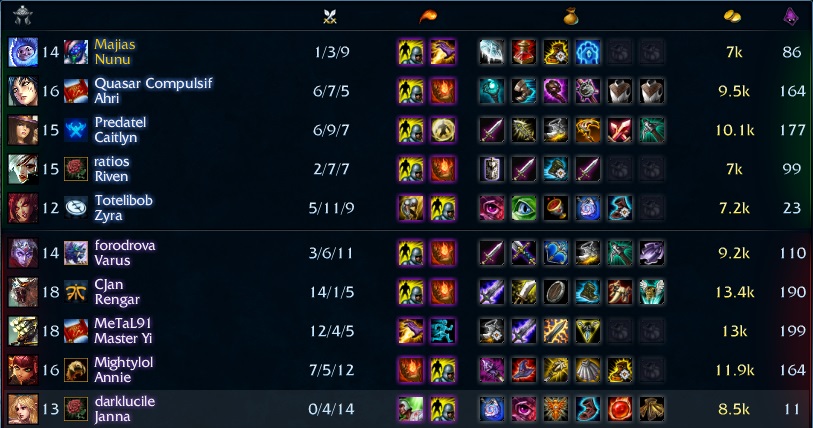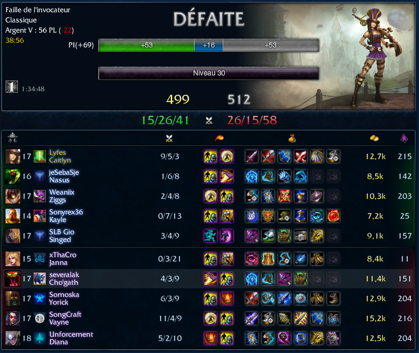 Une game hard carry sur vayne, un 4v5 perdu en 46 minutes (leur inhib était à 3 hits à un moment hihi), un dodge à cause de free = -14 elo