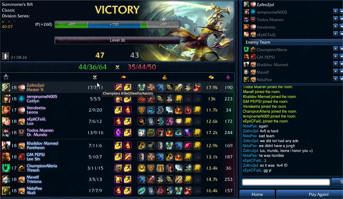 J'ai dit exactement à mon adc quoi faire, on prend un kill sur Thresh au level 2, puis on a farm Quinn à chaque fois qu'elle revenait sur la lane. On prend la tower, on décale mid, on prends deux tours et on tue le mid+jungler. On prends 2 inibh ensuite, baron, finit en 25min.