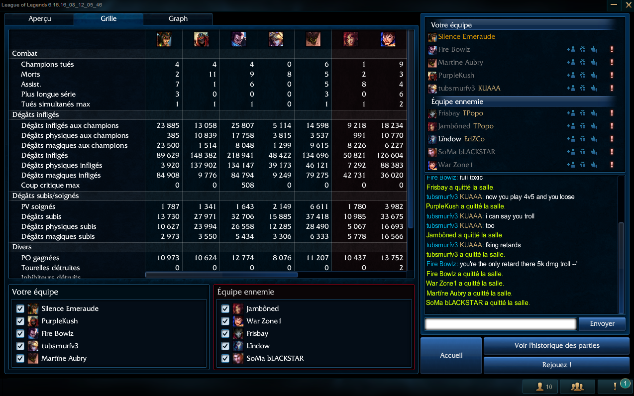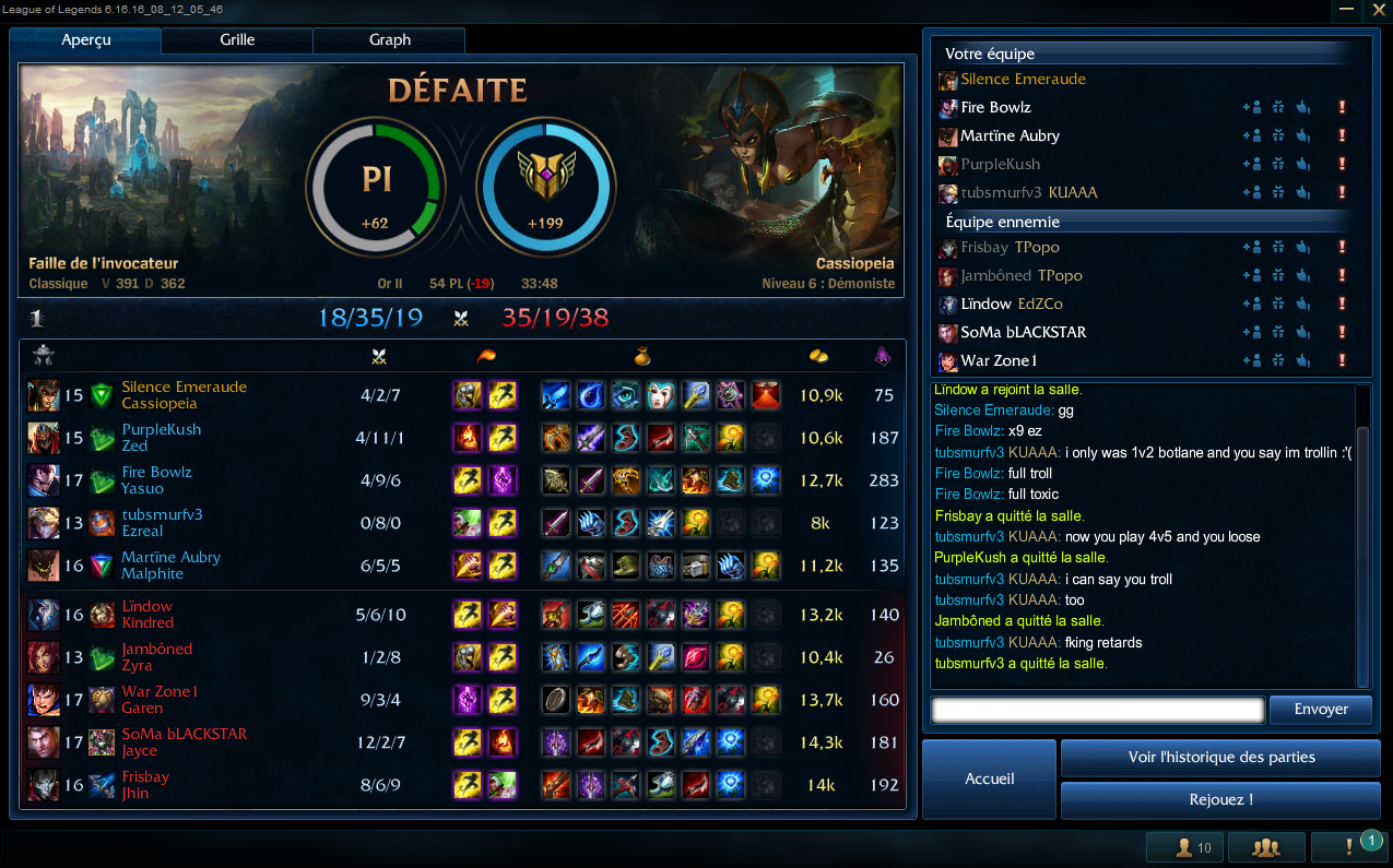 Le zac aura réussit a carry la team adverse. J'aimerais bien avoir 5 kill gratuit avant 15 minutes. Le Ekko qui était surement premade avec le Zac a dit que c'est pas le zac qui trollait mais moi. Ah d'accord. Le Lee en face qui a bien compris que le Zac troll c'est dit que il devait montrer aux gens son e-penis en disant que il était juste trop fort et que on était juste tous nul. Encore avoir du troll c'est LoL ça arrive mais mélangé avec du e-pénis et la mauvaise foi de certains... |
