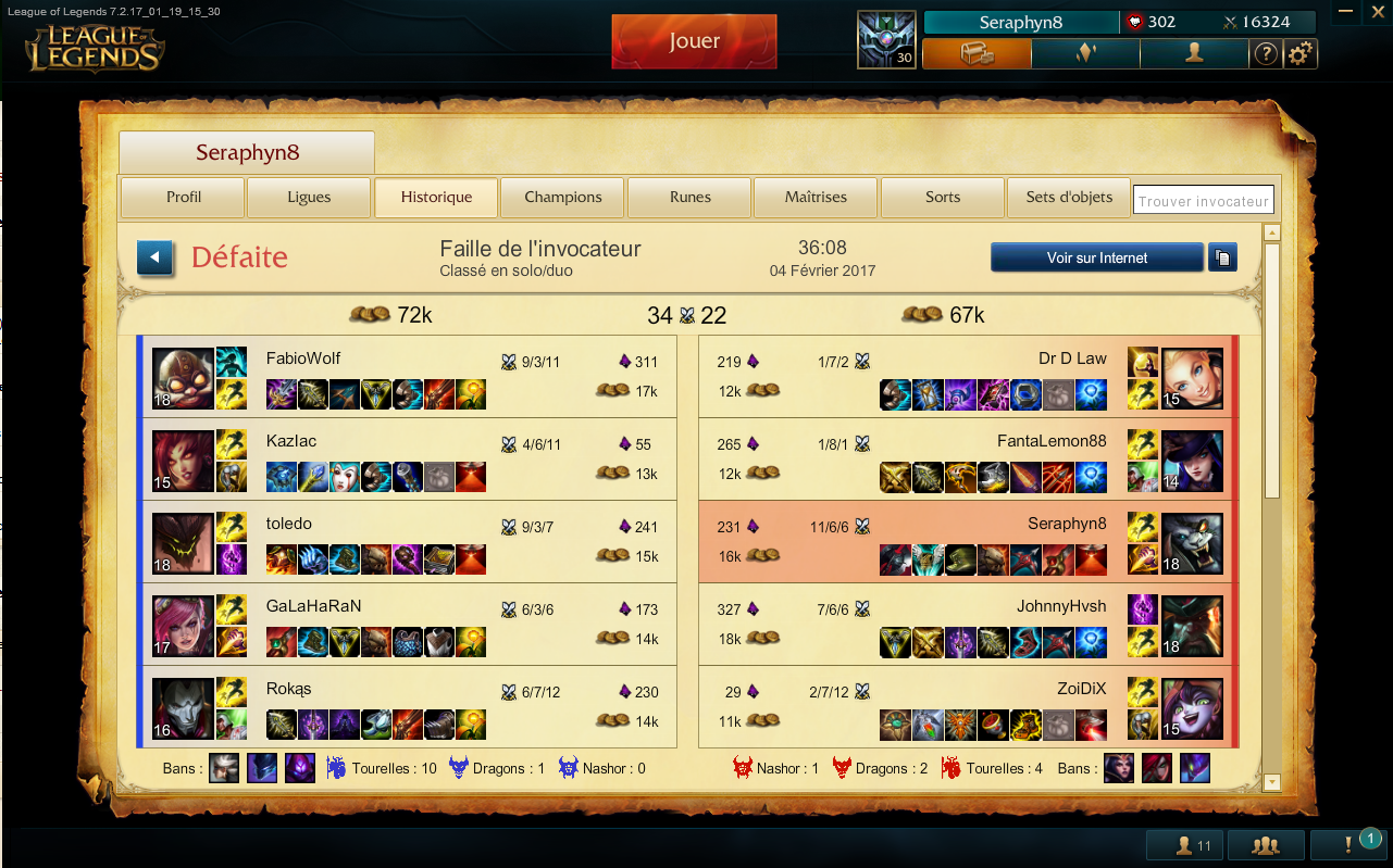 http://matchhistory.euw.leagueoflege...1813/202076027 2 KP en tant qu'adc, 3 en tant que midlaner, il faut savoir qu'ils m'auront insulté toute la partie parce que je puais selon eux. Jusqu'aux deux derniers fight, la vi était en 2/2/2, et je lui ai steal le nashor. C'était incroyable j'ai vraiment l'impression d'être tombé avec deux mecs silver qui viennent de découvrir la ligue Et puis j'ai voulu retag ce soir : http://matchhistory.euw.leagueoflege...8893/202076027 Encore une bonne game