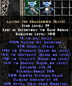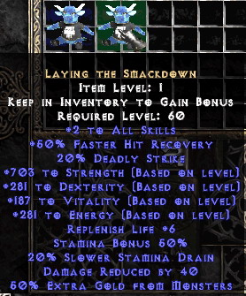 Pour le reste 2 andrea's world pour le reduce skill points, 1 gimme a hand charm et quelques annihilus.