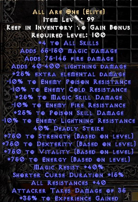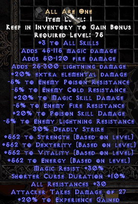 Tous les charmes uniques normaux et élite + 4 ou 5 annihilus : + 20 @ environ