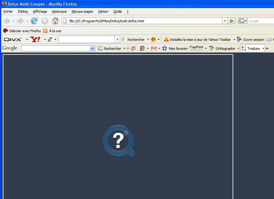 mais pas sur le portable que j'ai là, quand j'ouvre le fichier html j'ai bien les 2 écrans dofus mais je n'arrive pas à l'étape d'identification, ça bloque sur la (magnifique) image de démarrage avec en bas a gauche "Cliquez ici pour voir les solutions" et ça ne bouge pas :/