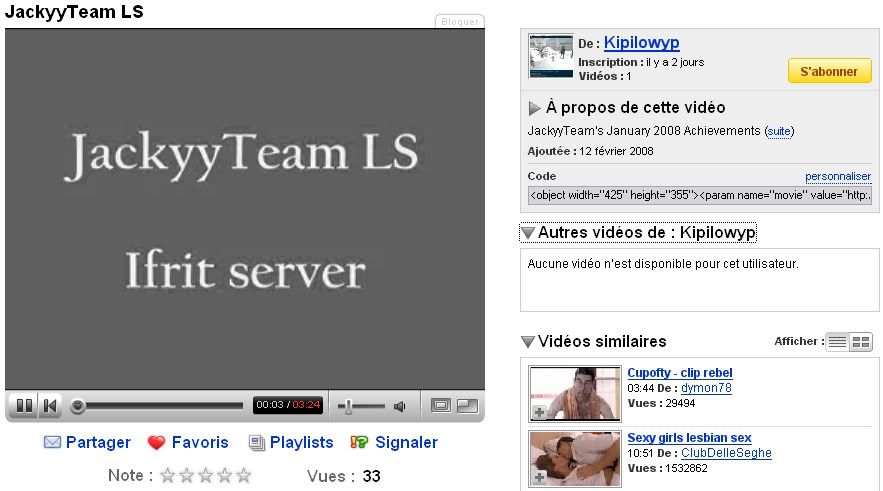 ![]() J'ai trouvé très approprié le lien "sexy lesbian girls" dans les vidéos similaires, parce que c'est clairement en rapport ![]() Je mets juste le lien du screen pour ne pas choquer les âmes sensibles : http://i271.photobucket.com/albums/j...20stuff/Tj.jpg |