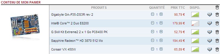 La 8800GT reste chère, oui, tu peux en trouver une pour 10€ de plus que la Radeon, en restant encore chez CDiscount. Avec le proc, non tu ne perds pas que 2Mo de cache... Ce n'est pas la même génération de proc, même si la E8200 est pour le moment chaud à trouver. Pour la CM, ouais si tu veux... La RAM aussi, ça va. Je te rappelle tout de même que tu veux un PC qui te tienne un bon moment, le mieux est donc, imo, de partir sur le plus qualitatif, car c'est ce qui a le plus de chance de t'emmener loin avec un qualité ludique confortable. Si après vraiment tu veux partir sur un truc moins cher, tu peux biensûr... Mais perso quand je vois ce que tu peux avoir aujourd'hui pour l'équivalent de 4000F avec l'inflation qu'on s'est mangé en quelques années, je me dit qu'on vit une époque pour se faire des bêtes de machines. Ton charlatan qui voit l'avenir informatique à 5 ans et qui te dit qu'avec une 8600GT tu pourras jouer à WAR, je veux savoir d'où il tiens cette info en or. Perso je lui prendrais pas une vis dans son mag. PS: je sais pas où tu habites, mais avec materniel.net (et d'autres peut-être??) tu peux te faire livrer gratuitement à un relais) |