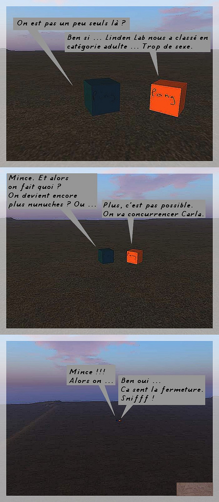 Bon eh bien pour être la première a être du côté de Linden Lab (pour une fois), je suis bien contente de cette constitution de zones "adultes" où les perturbés pourront faire leur petite affaire dans leur coin, car j'en ai MARRE de voir à tout bout de champ, y compris chez moi moi ou de l'autre côté de la barrière du jardin des avatars en tenir d'autre en laisse avec un fouet dans l'autre main et l'autre lui dire "oh oui maître(sse) je te suis soumis(e)". Ou encore des avatars d'enfants en tenue plus que "sexy" quand on sait que ce sont des adultes derrières...